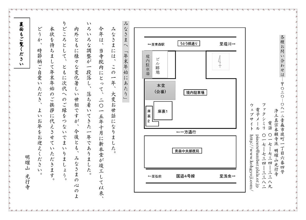2016(平成28)年度 明耀山光行寺除夜会・元旦会のご案内明耀山光行寺2016年12月27日読了時間: 1分 年末年始のご挨拶とともに、除夜会・元旦会のご案内をさせていただく時期となりました。今日現在は、降雪がなく比較的穏やかな冬空です。お体お気をつけて。